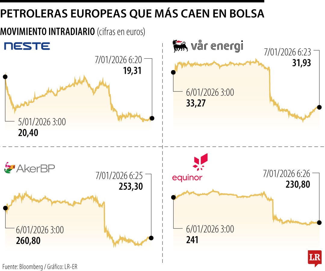 Las empresas nórdicas Neste, Var Energi, Aker BP y Equinor son las que más caen del índice. El grupo energético francés TotalEnergies baja entre un 2% y un 3%