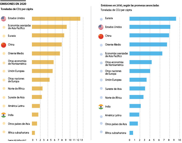 Para 2030, las emisiones de CO2 en Estados Unidos, según sus promesas de reducción, serán 30% más bajas, con emisiones per cápita cayendo a ocho toneladas de emisiones contaminantes. A pesar de esta disminución, las emisiones per cápita en EE.UU. seguirán siendo tres veces más altas que el promedio mundial en el objetivo de cero neto de emisiones en 2030.