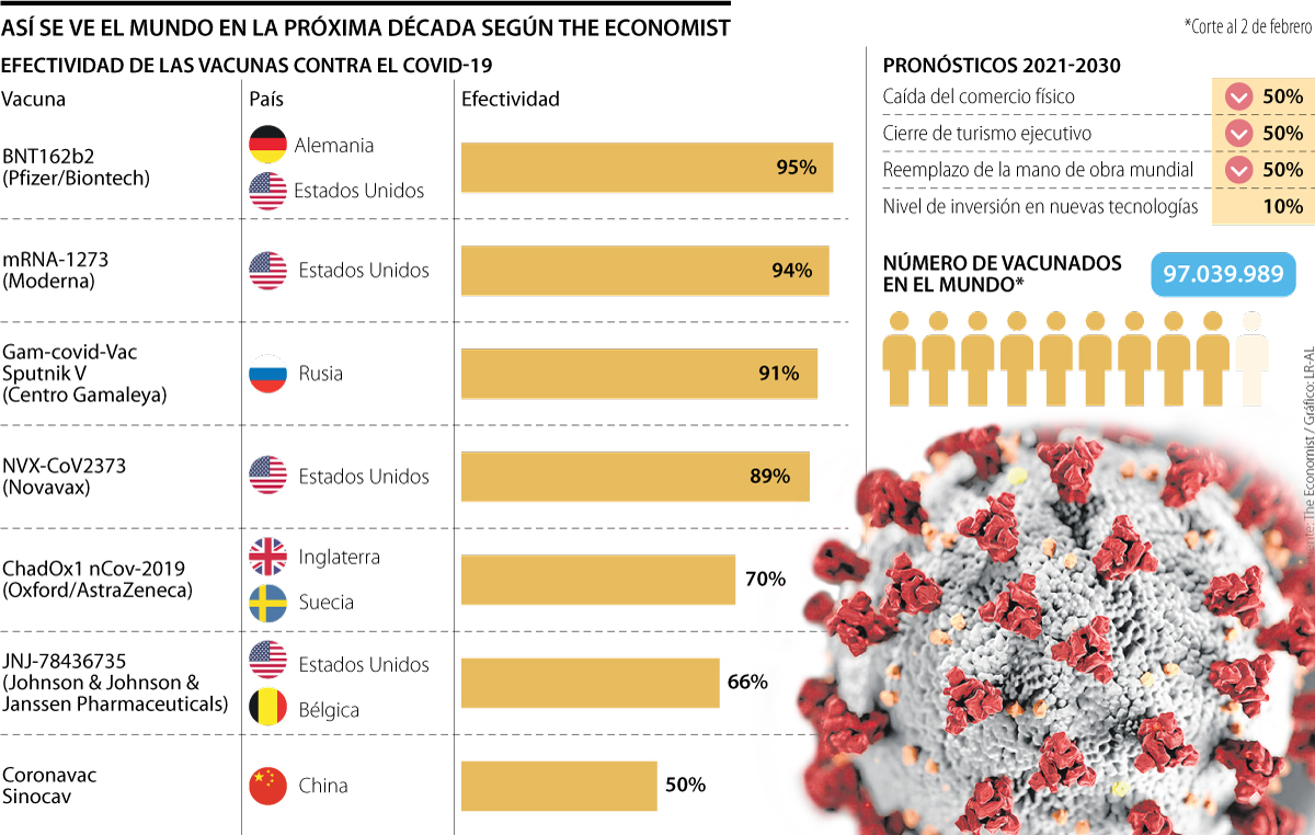 Sin embargo, ‘extremistas’ o no, The Economist pone sobre la mesa la visión de 50 expertos que participaron en el informe ‘Hacia una nueva normalidad 2021-2030’ y que señalan 20 escenarios posibles en los próximos años, contemplando los retrasos en los programas de vacunación y el desarrollo de la pandemia durante los próximos años.