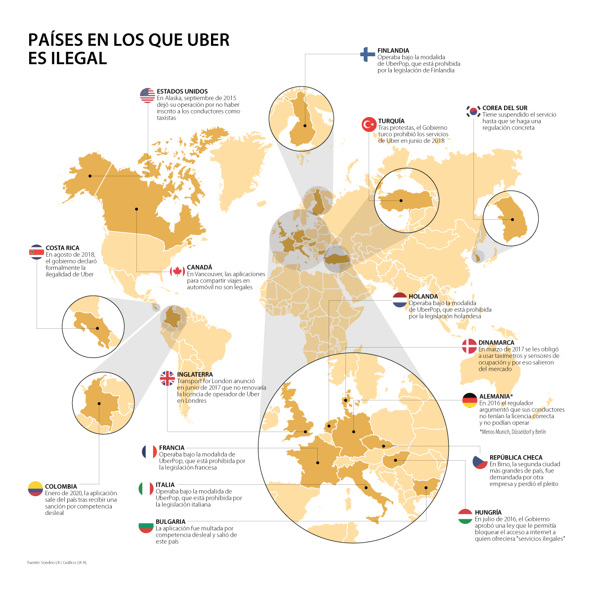 En otras partes del mundo como en Costa Rica y en Vancuver (Canadá), el servicio que presta la firma estadounidense no es legal. En el primer país, luego de varios años en que se enfrentaron a diferentes procesos, el Gobierno de esa nación determinó que era ilegal, mientras que en la ciudad canadiense, la plataforma tuvo que salir, ya que las aplicaciones para compartir viajes en automóvil no son legales.