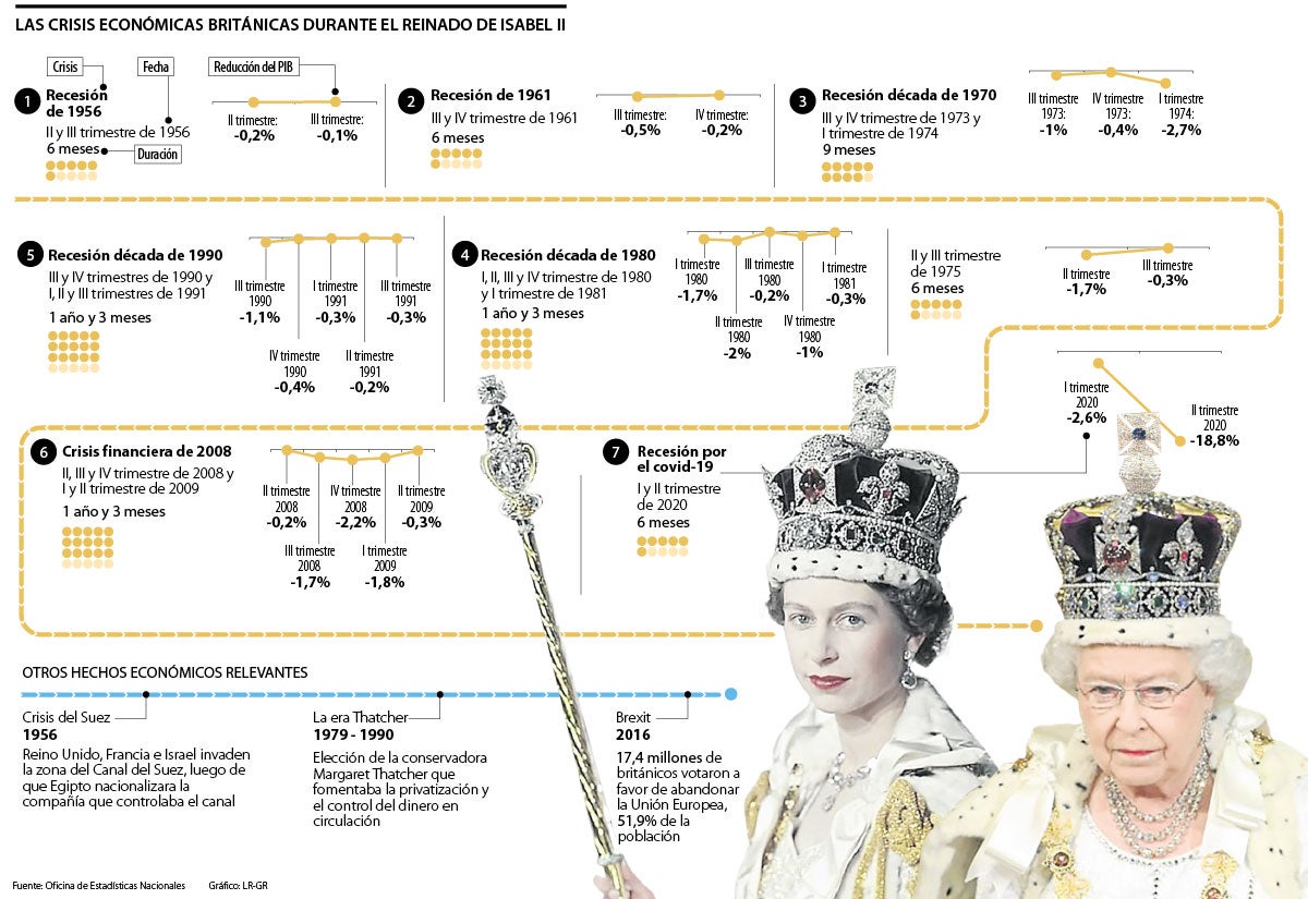 Durante los 69 años de su reinado, el Reino Unido se ha logrado recuperar de siete recesiones distintas desde 1956, apenas tres años después de su coronación, hasta la reciente crisis por la pandemia.
