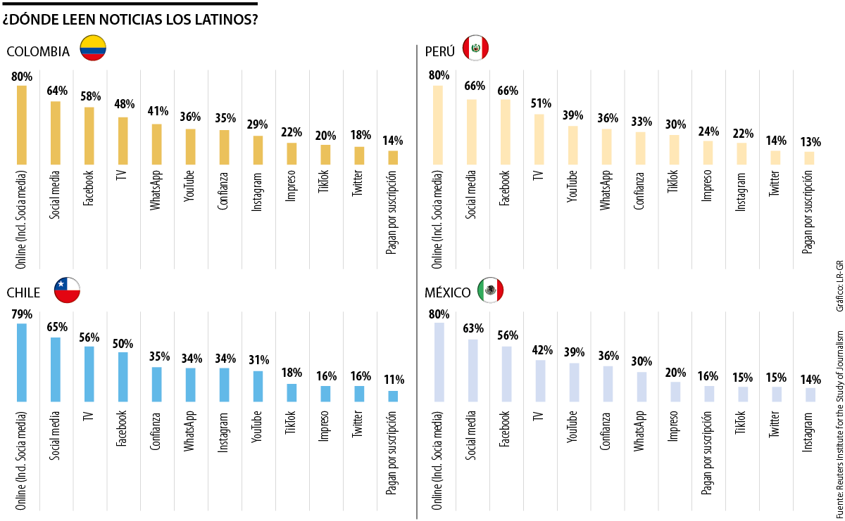 Del bloque, el país que más confía en las noticias es México con 36% de sus usuarios, y ocho de cada diez las lee a través de internet (63% del total en redes sociales). Luego aparecen Chile y Colombia con una confianza de 35% y el más desconfiado es Perú con 33%.