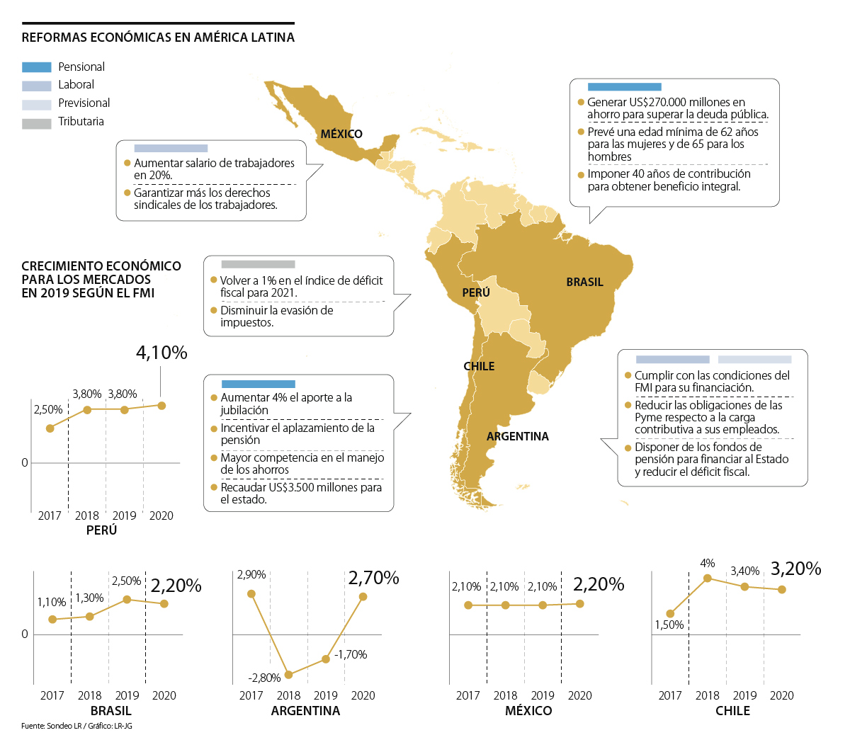 Con el objetivo de enfrentar estos desafíos, y unido a las diversas dificultades domésticas que presenta cada país en la región, Brasil, Argentina, México, Perú y Chile son los países que preparan reformas estructurales a sus finanzas este año.