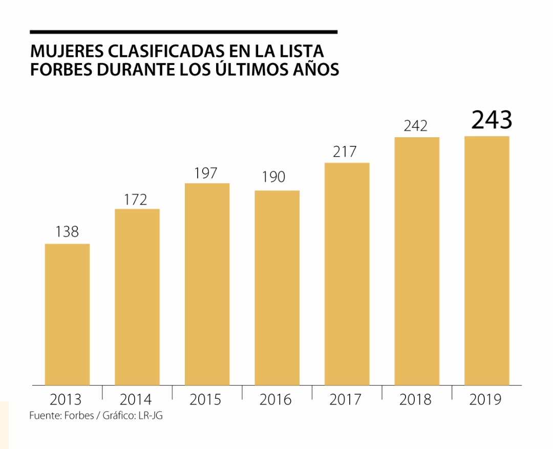 Las mujeres también pusieron su cuota en la lista de las más ricas según Forbes en 2019. Si bien sigue siendo un ranking liderado por los hombres, cada vez hay más participación de las mujeres. Según los últimos datos, en 2010 solo había 93 empresarias, en la última edición, la cifra ascendió a 243.