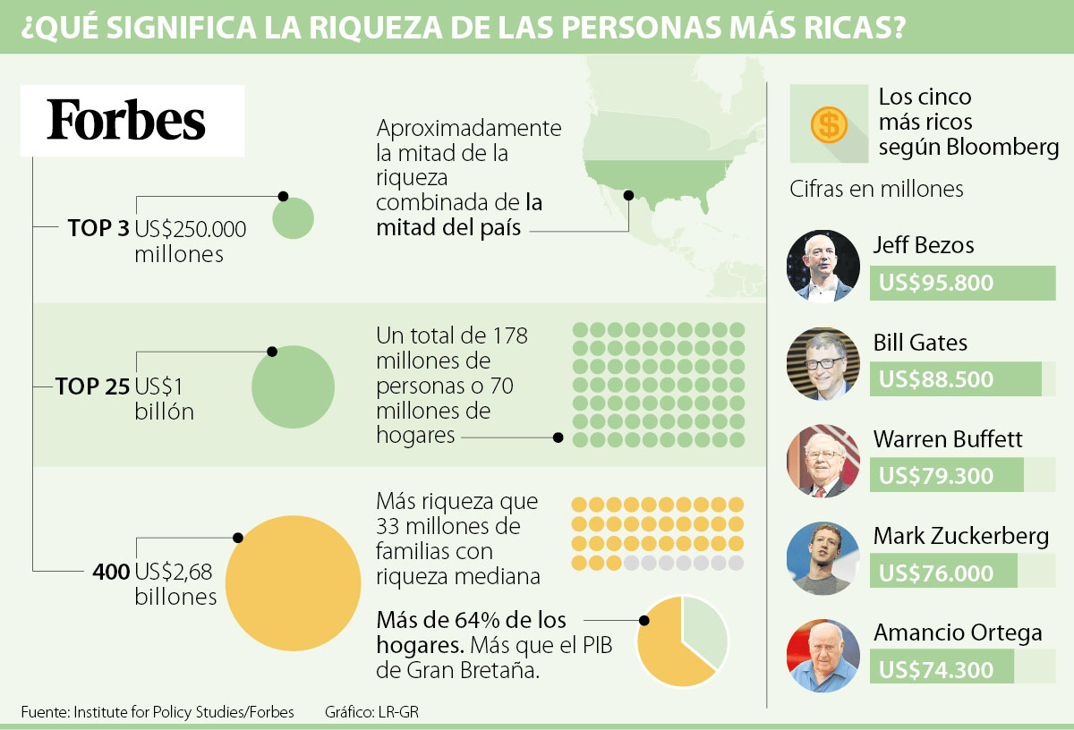 Para llegar a esta afirmación, el instituto tomó como referencia la lista de la revista Forbes de los 400 más ricos y la comparó con el resto de la población de Estados Unidos. Bill Gates, el fundador de Microsoft; el inversionista Warren Buffett, dueño de Berkshire Hathaway, y Jeff Bezos, a la cabeza de Amazon, acumulan más dinero que cerca de 160 millones de personas, equivalentes a 63 millones de hogares estadounidenses.