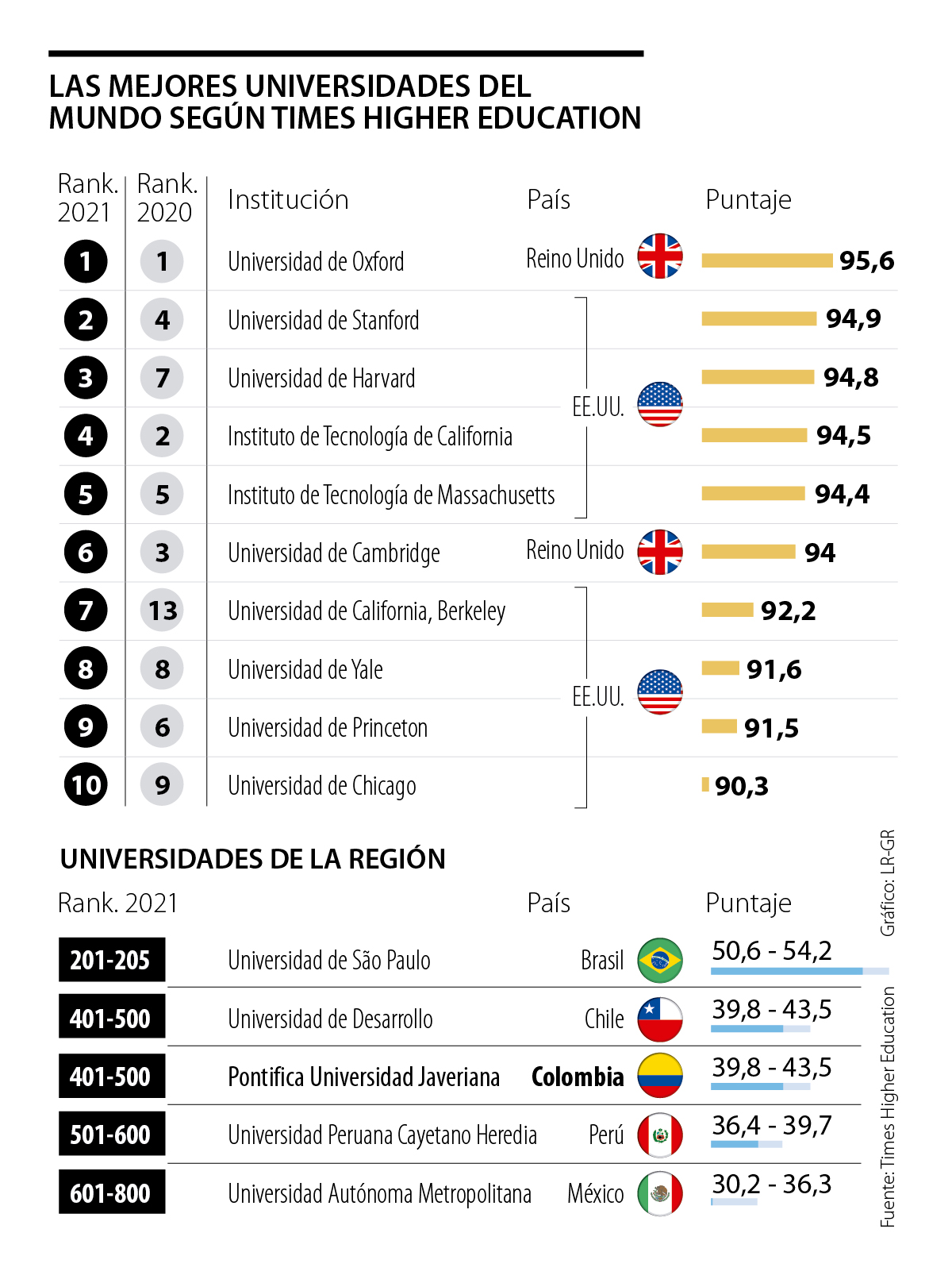 Times Higher Education (THE) presentó los resultados de su World University Rankings 2021, un estudio que lista las mejores universidades el mundo. En este predominan las universidades estadounidenses y británicas y subraya la “fuerza cambiante de la educación superior e investigación” en todo el mundo.