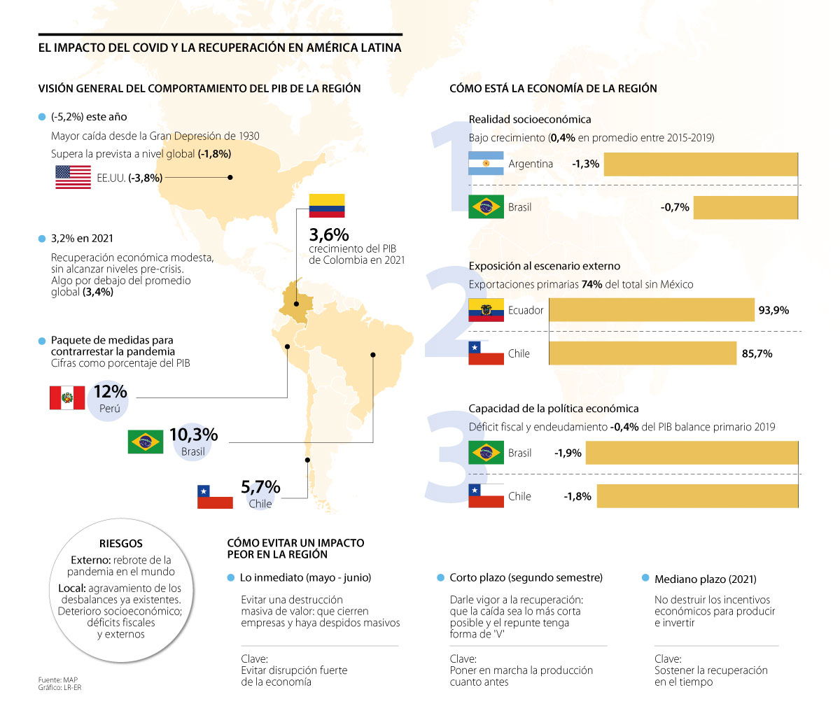 A pesar de que el decrecimiento será generalizado en los países latinoamericanos, MAP Economics and Business Advisors resaltó que la economía colombiana podría presentar una recuperación de hasta 3,6% durante el próximo año y convertirse en una de las menos afectadas por el choque de la pandemia del covid-19. Para lograr este avance, el mercado local tendrá que afrontar grandes retos en materia de medidas económicas y regulatorias.