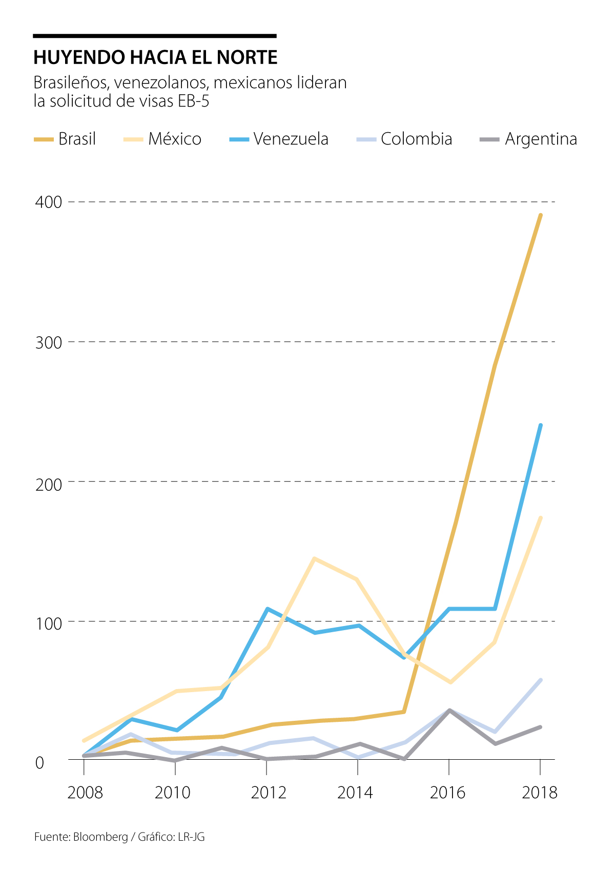 Para los brasileños, el número de visas del programa, conocido como EB-5, se multiplicó por diez entre 2015 y 2018 mientras la mayor economía de América Latina luchaba por salir de una recesión. El total de Venezuela se disparó a medida que se adentraba en una espiral de hiperinflación. En el caso de México, el aumento coincidió con la exitosa campaña presidencial del populista de izquierda Andrés Manuel López Obrador. Los tres países también han sufrido oleadas de crímenes violentos.