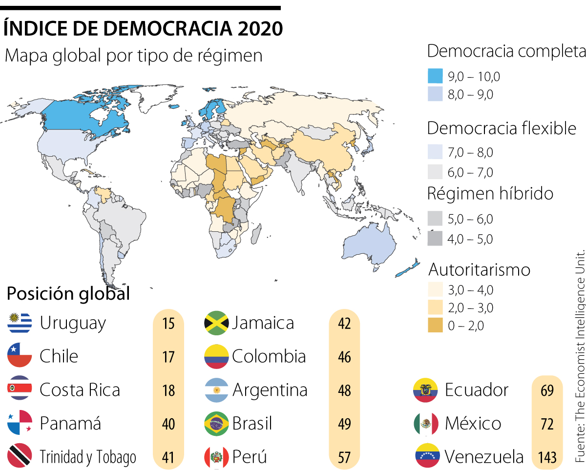 De acuerdo con el más reciente informe de la Unidad de Inteligencia de The Economist, 75 de los 167 países clasificados en el índice de Democracia 2020, que representan 49,4% de la población mundial, viven en una democracia de algún tipo. De los habitantes del planeta, solo 8,4% residen en una democracia plena y se ubican en 25 países del globo. De estos, solo tres están ubicados en América Latina y el Caribe.