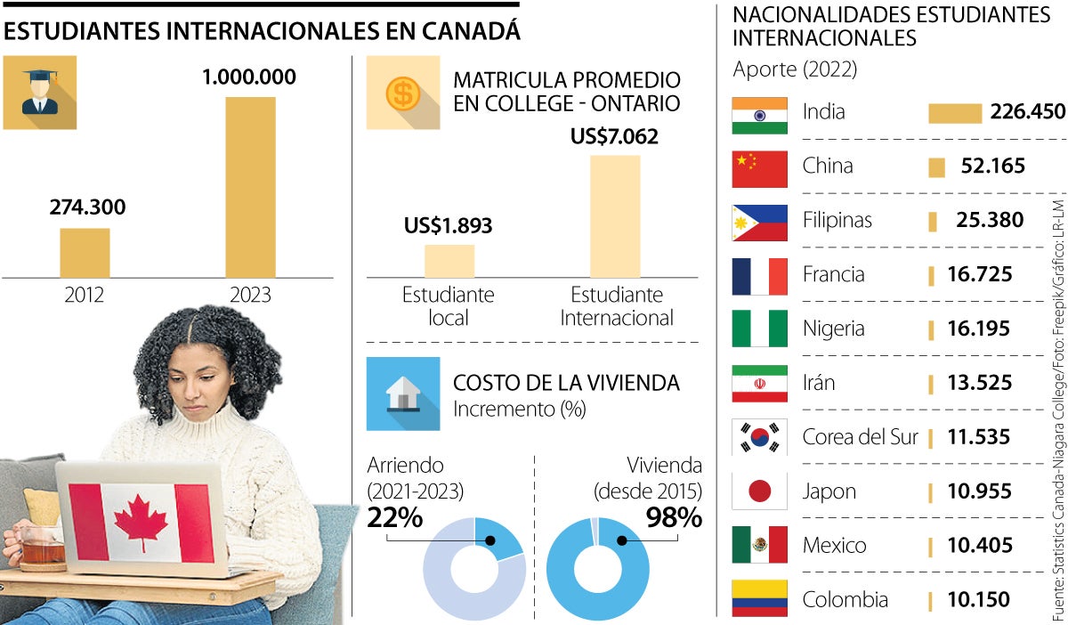 En línea con esta idea, el gobierno federal anunció recientemente un aumento en los requisitos para aplicar al visado de estudiante postsecundario, elevando de $10.00 dólares canadienses ($29,2 millones) a $20.635 dólares canadienses ($60,3 millones) los fondos requeridos para demostrar la disponibilidad de recursos a la hora de emprender el viaje. Esto en medio de un escenario en el que la autoridad migratoria prevé que, de mantenerse la tendencia actual, para el 2027 la cifra de alumnos internacionales admitidos llegaría a 1,4 millones de personas.
