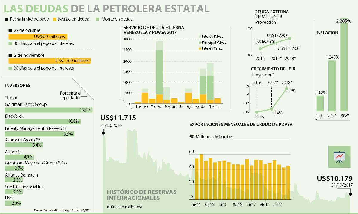 A esto se le suma que en menos de 48 horas deberá hacer un desembolso de US$1.200 millones por concepto de un segundo plazo previamente pactado. El exdirector de Pdvsa, José Toro Hardy, explicó a LR que “la compañía viene incurriendo en otros retrasos, pero hasta el momento sería la primera vez que no cumple con una deuda financiera en materia de bonos, así que otra consecuencia es que se bloquearía el funcionamiento comercial y llevaría a Venezuela a un default sin precedentes”. Según Reuters, Venezuela canceló la semana pasada con retraso US$74 millones que debía pagar el 16 de octubre a tenedores de unas obligaciones.