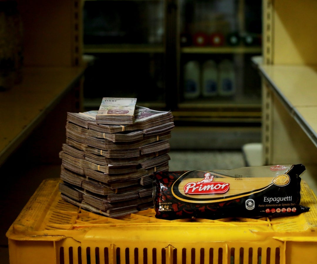 Un paquete de 1 kg de pasta se muestra junto a 2.500.000 bolívares, su precio, equivalente a US$0,38