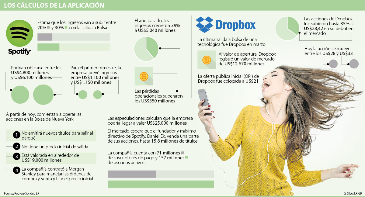 Más de 157 millones de personas en el mundo tienen una cuenta activa en Spotify y cualquiera de ellas podría llegar a tener una acción de la plataforma de música, que hoy sale a la Bolsa de Nueva York con un modelo de cotización directa que, pese a sus riesgos, le abre paso a los inversionistas más pequeños. Los cálculos indican que esta aplicación podría alcanzar un valor de mercado de hasta US$25.000 millones.