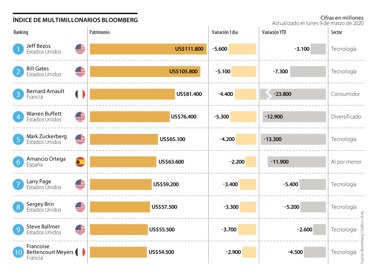 Lo anterior impacto los patrimonios de los más ricos. Por ejemplo, los 10 más poderosos perdieron US$40.100 millones el 9 de marzo de 2020, de acuerdo con el Índice de Multimillonarios que elabora Bloomberg y en el que se incluye a las 500 personas más ricas del mundo.