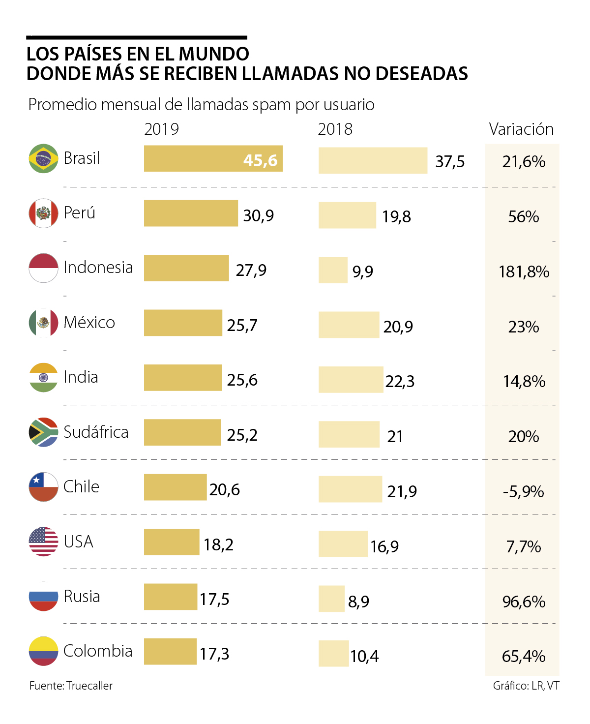 En 2018, Perú ocupó el cuarto puesto en el ranking, siendo superado por Brasil (1°), Chile (2°) y México (3°). Este año sigue siendo liderado por Brasil, que pasó de recibir 37,5 llamadas no deseadas al mes a 45,6. Perú pasó de recibir 19,8 llamadas mensuales por usuario a 30,9 llamadas; es decir, al menos una llamada todos los días.