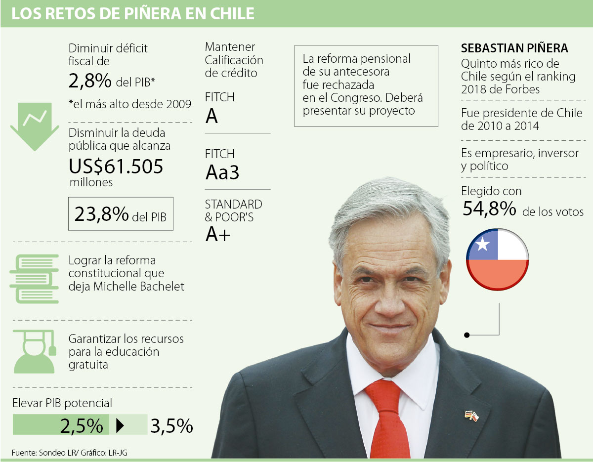 El nuevo presidente, además, deberá recobrar la senda de crecimiento, pues desde que la tasa pasó de 4% a 1,9% en 2014, no ha vuelto a repuntar. El Fondo Monetario Internacional elevó la proyección de crecimiento a 3% para 2018. Su quinto desafío será la advertencia que lanzaron las firmas calificadoras de riesgo, que dijeron que estarán pendientes de la relación del presidente con el Congreso que contará con una participación más baja de la centroizquierda e izquierda con relación al año pasado, pero sin embargo mantiene su poder. El Partido Renovación Nacional de Piñera ocupará 16,20% de los escaños.
