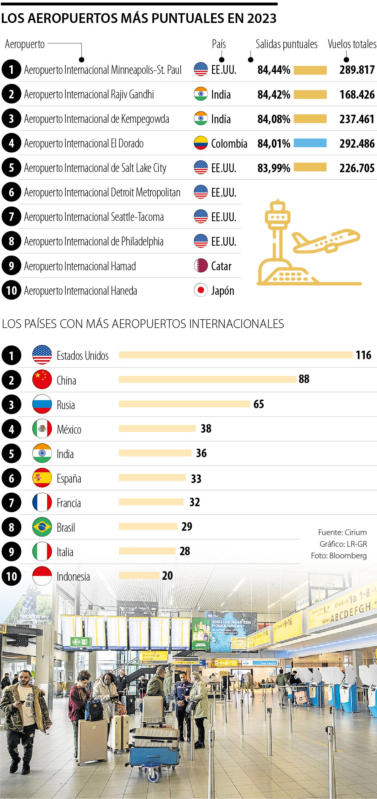 Pero no necesariamente la mayor cantidad de aeropuertos significa que son los de mejor desempeño, pues el ranking de países se cambia si se revisa los más puntuales. Al ver el escalafón, El Dorado, de Bogotá, resalta en la lista, además de ser el único de América Latina entre los primeros 10.