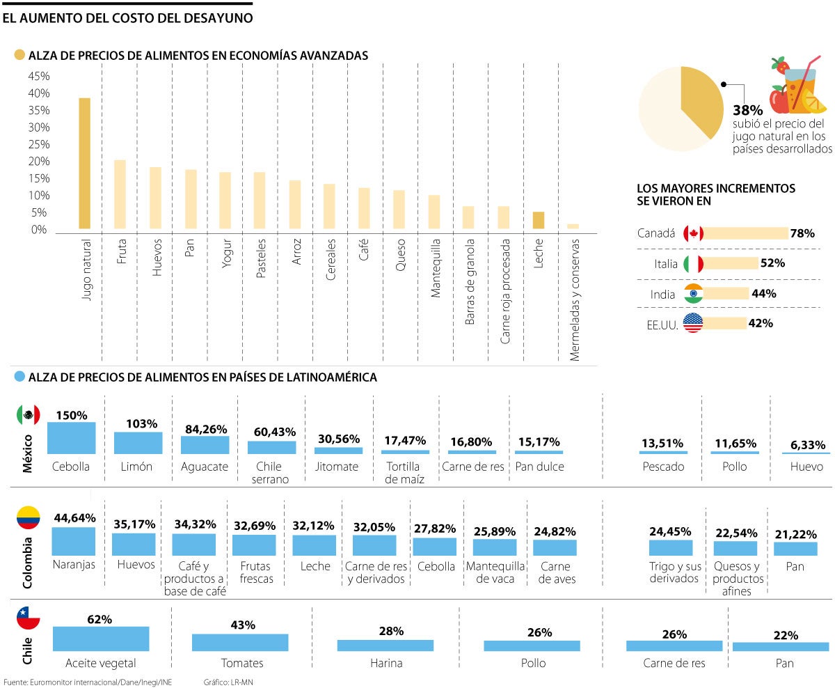 Según cifras del Departamento Administrativo Nacional de Estadísticas (Dane), la inflación de alimentos anual en Colombia fue de 26,17% en abril. Los productos del desayuno que más sufrieron incrementos fueron las naranjas (44,64%), los huevos (35,17%), el café (34,32%), las frutas frescas (32,69%), la leche (32,12%) y la carne (32,05%).