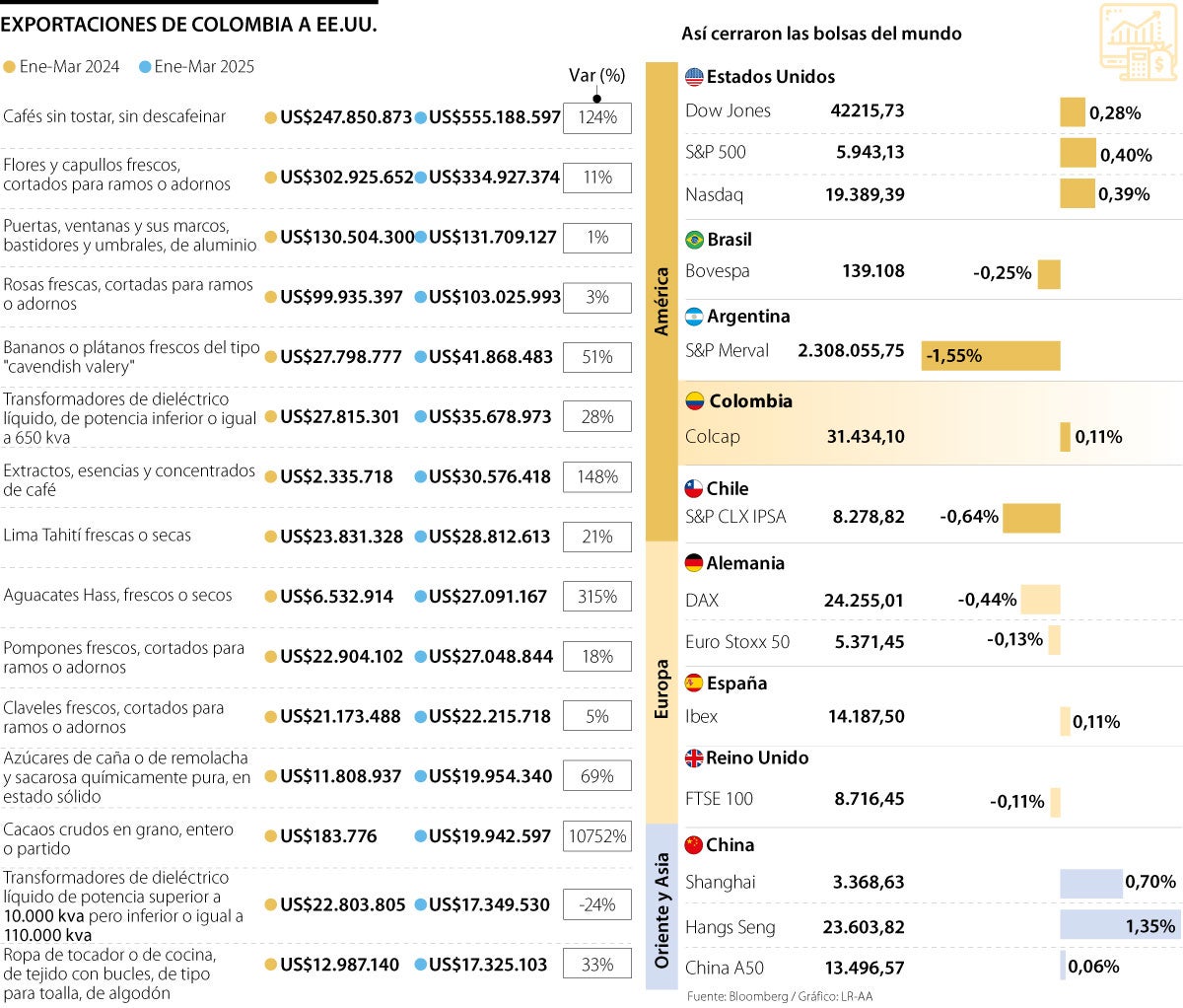 Colombia sería uno de los grandes beneficiados porque todos los productos, salvo acero y aluminio, quedarían sin la imposición arancelaria. En el primer trimestre, llegaron a EE.UU. productos colombianos por US$3.580 millones, un crecimiento de 15%. Estados Unidos es el mercado principal para el país: el café y las flores son dos de los productos estrella de las ventas externas colombianas.