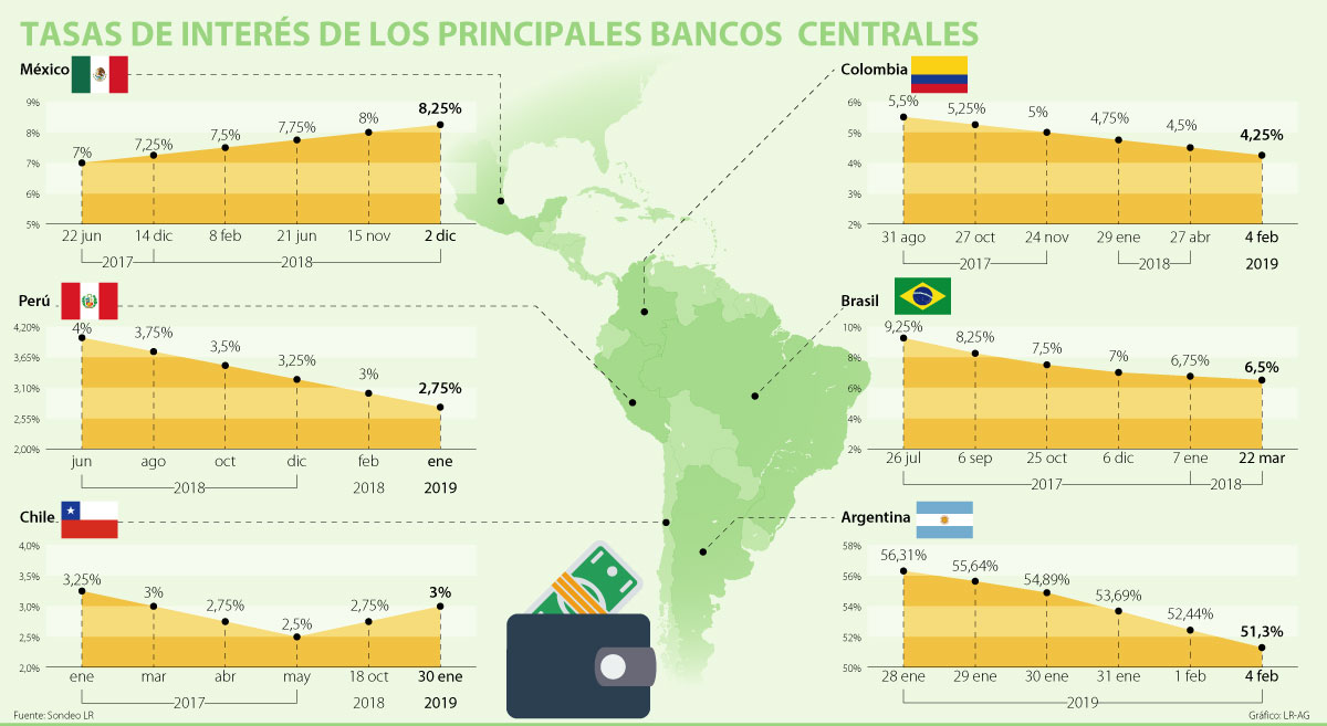 Todo esto tendrá especial impacto en economías como las de Argentina y México, que en un ambiente de bajo crecimiento económico, no tendrán espacios para maniobrar con sus tasas de interés. El Banco Central de Argentina, sometido a una inflación de 47,7% al cierre de 2018, mantiene sus tasas en 56,31%, y Banxico, en menor proporción, registra 8,25%, una de las tarifas más altas de América Latina.