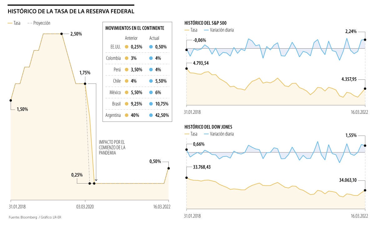 Los temores del efecto inflacionario (que de hecho proyectan ahora en hasta 5,5% al cierre del año) impulsaron la decisión de la Reserva Federal. El Comité Federal de Mercado Abierto que fija las tasas aprobó la decisión en una votación de ocho a uno. Se trata del séptimo movimiento en el continente, después de la intervención de los bancos centrales de Colombia, Perú, Chile, México, Argentina y Brasil; este último podría subir nuevamente en reunión de la próxima semana.