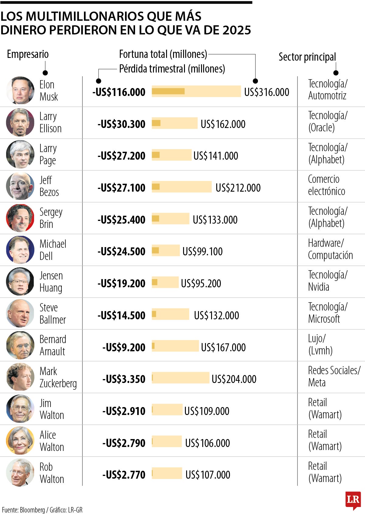 La medida sacudió los mercados internacionales, generando un efecto dominó dentro de las principales fortunas del mundo, especialmente en el sector tecnológico y de lujo. Con base en los datos de Bloomberg, las riquezas personales sufrieron pérdidas colectivas que superan US$308.000 millones en el primer trimestre de 2025, lo que evidencia la fragilidad de los patrimonios que están atados a la volatilidad del mercado bursátil.