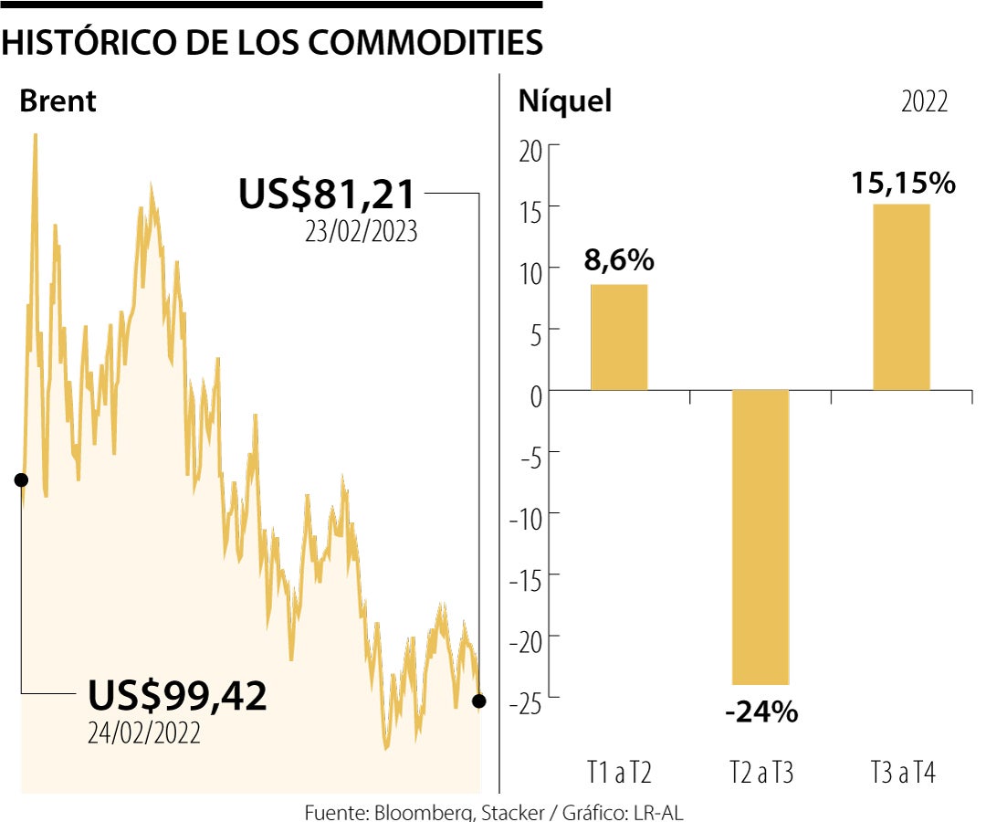La restricción a la importación de petróleo ha hecho que los precios se disparen. En marzo de 2022, el barril Brent llegó a los US$139, el nivel más alto desde julio de 2008. Otro commoditie como el níquel tuvo una cotización de hasta un 111%, luego de iniciar la guerra.
