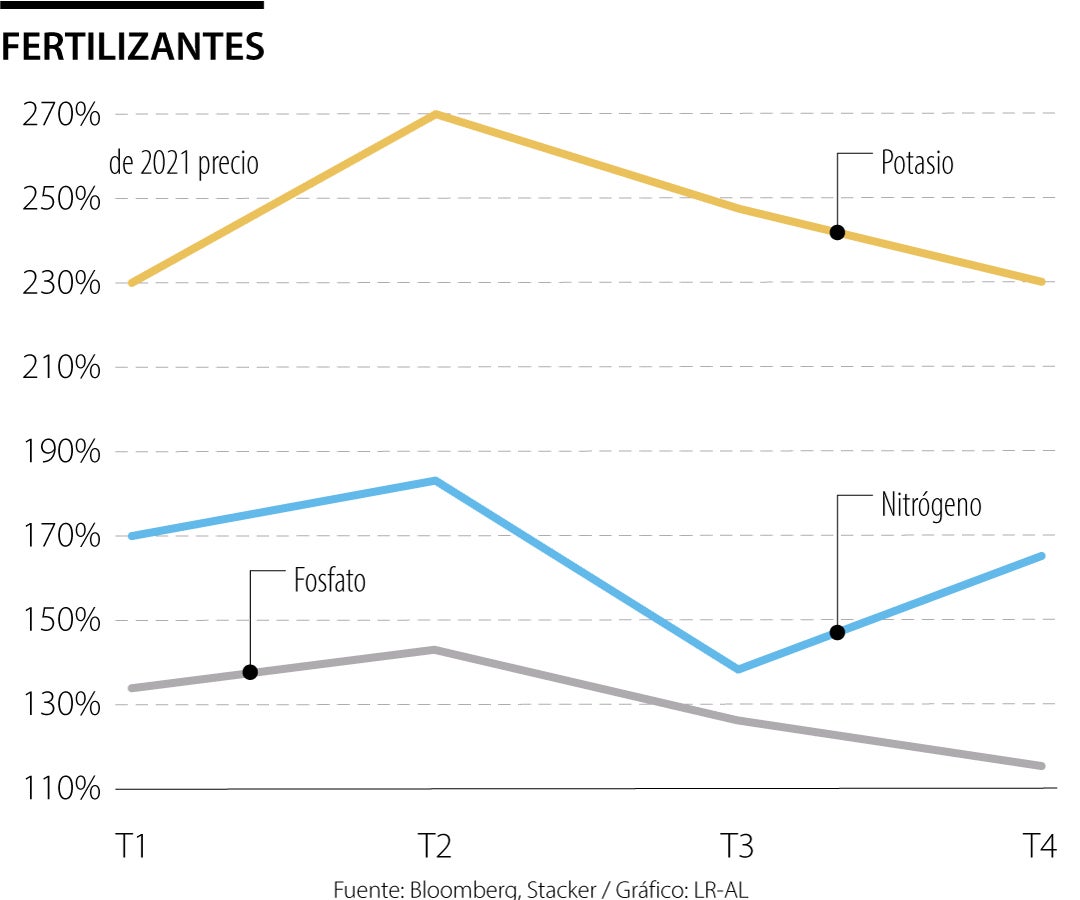 El precio de los fertilizantes aumentó del primer trimestre de 2022 al segundo trimestre de ese mismo año. Las sanciones impuestas a Rusia y Bielorrusia han interrumpido las exportaciones mundiales y aumentado los precios. En parte por el alza en la energía.