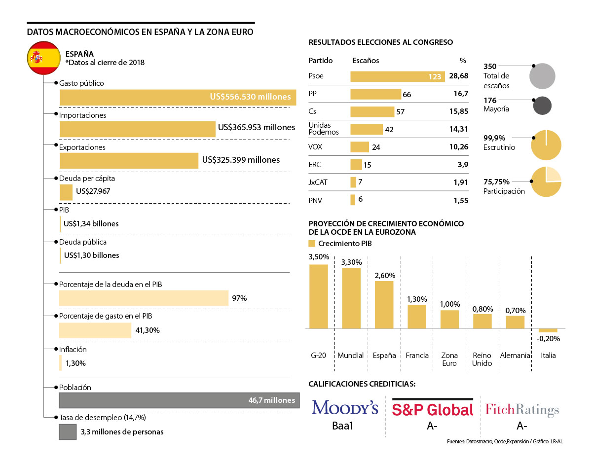 De acuerdo con el Ministerio de Hacienda de España, la deuda pública llega a US$1,30 billones que comprometen 97% del PIB. Al cierre de 2018, el país registró una producción bruta de US$1,34 billones, 3,4% más que en 2017.