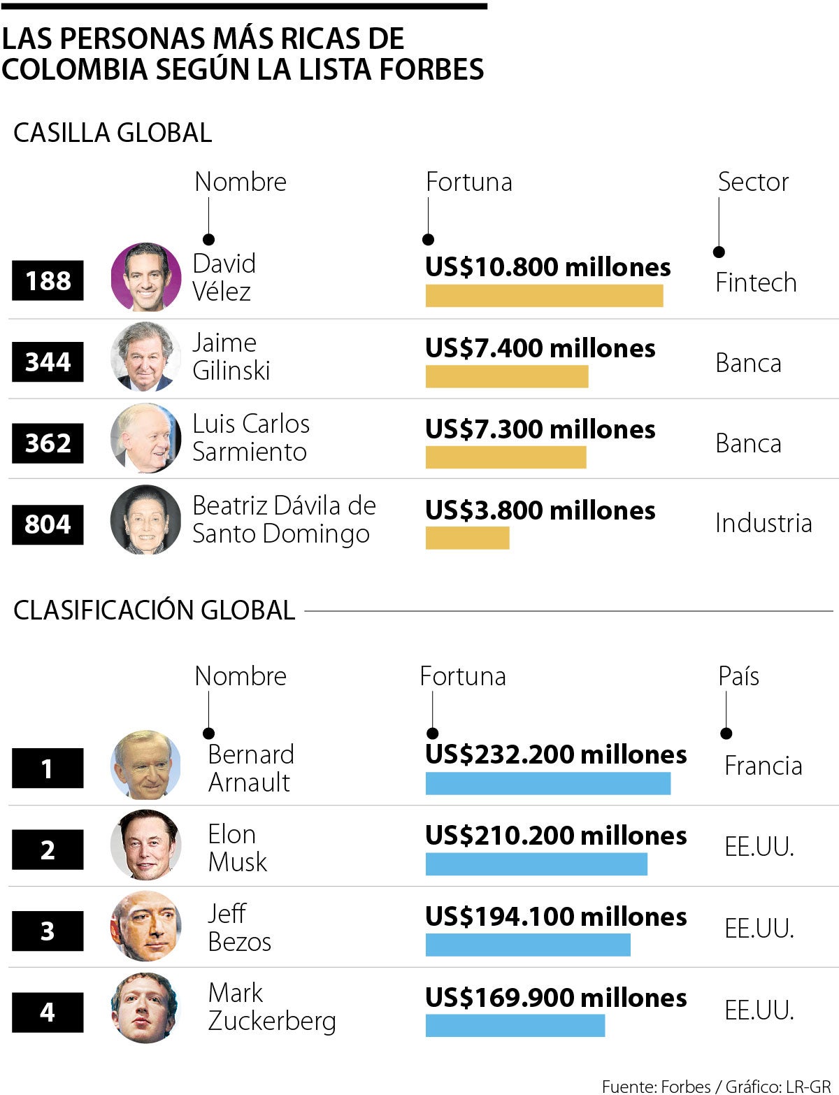 En el caso de Colombia hay un reducido grupo de cuatro personas que acumulan un patrimonio de US$29.300 millones: (David Vélez, Jaime Gilinski, Luis Carlos Sarmiento Angulo y Beatriz Dávila de Santo Domingo). En las cifras que presenta la revista resalta cómo la fortuna de Gilinski avanzó el último año, así como su posición en la industria, luego del negocio que le dio el control sobre el Grupo Nutresa, (incluso por encima del total de Sarmiento).