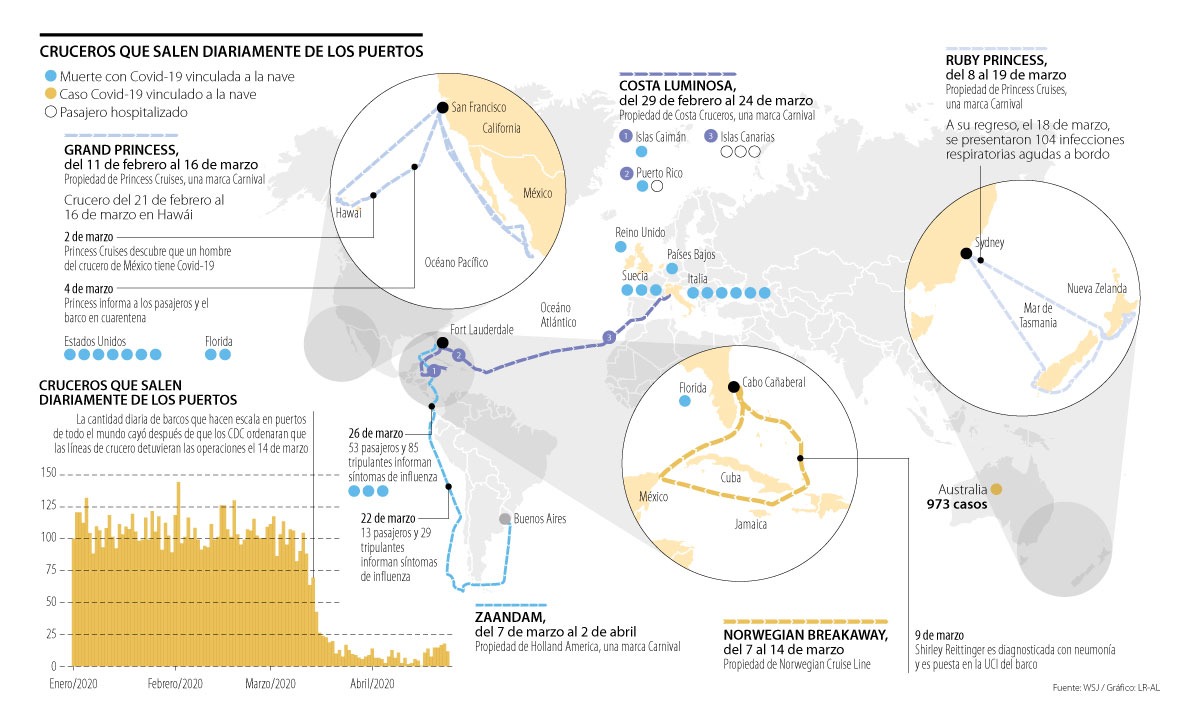 Funcionarios del gobierno en Australia, Nueva Zelanda, Canadá, República Dominicana, Trinidad y Tobago, así como comunidades en Iowa, Ohio, California, Minnesota, Florida, Hawái y Puerto Rico, rastrearon sus primeros casos de covid-19 o una aceleración local con infecciones a los viajeros de cruceros.