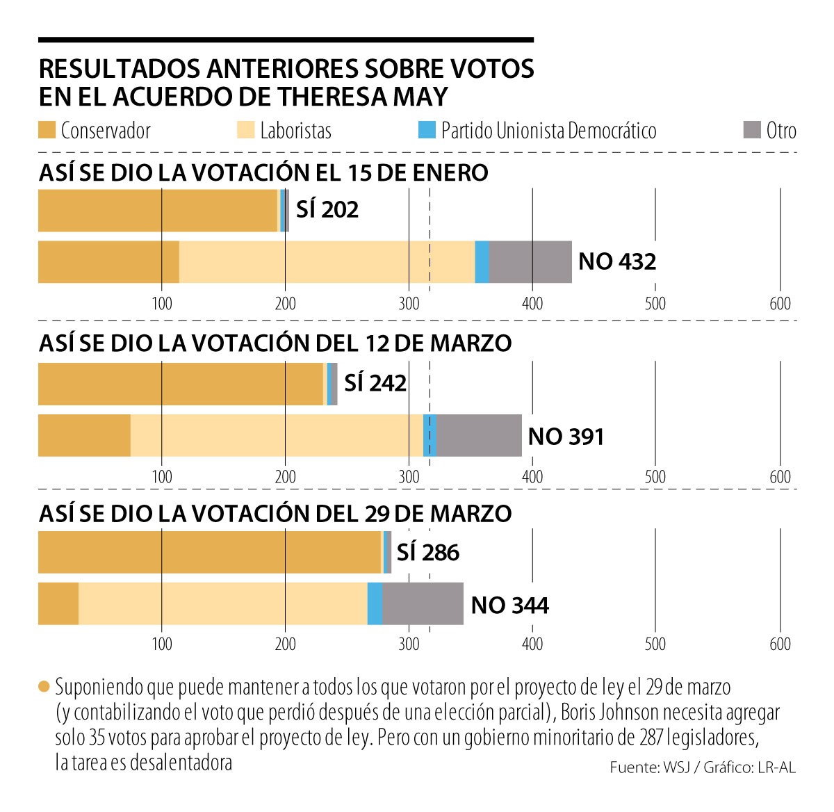 Johnson carece de mayoría en la Cámara de los Comunes de 650 asientos del Reino Unido. Sin embargo, solo tiene que obtener 320 votos para lograr su acuerdo porque alrededor de una docena de legisladores no participan en las votaciones parlamentarias.