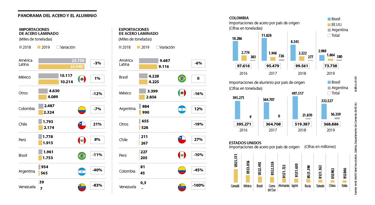La tercera casilla es ocupada por Argentina, cuyas exportaciones de acero laminado en 2018 se ubicaron en 884.000 toneladas y proyectan cerrar en 990.000 para 2019, mostrando un crecimiento del 12%. De llegarse a entrar en marcha las medidas arancelarias de Trump sobre Brasil y Argentina, tanto Juan Manuel Lesmes, director de la Cámara de Fedemetal de la Andi, como María Juliana Ospina, directora del Comité Colombiano de Productores de Acero de la Andi, coinciden en que lo más probable es que se dé una desviación de comercio. “Si no le venden a Estados Unidos seguramente van a tratar de buscar mercados amigos, pero no estoy muy seguro de que nos vaya a impactar muy fuerte en Colombia. Al menos no en un futuro cercano”, dijo Lesmes.