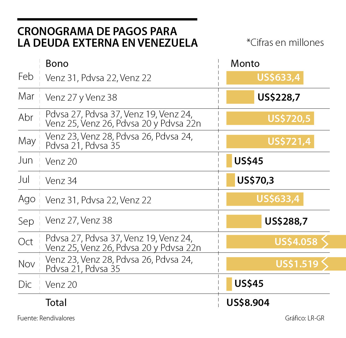 La agencia Bloomberg también destacó que los bonos al 8,5% se cotizaban en cerca de 90 centavos de dólar. Según información publicada en el portal de la firma Rendivalores, la deuda externa de Venezuela supera los US$8.000 millones.
