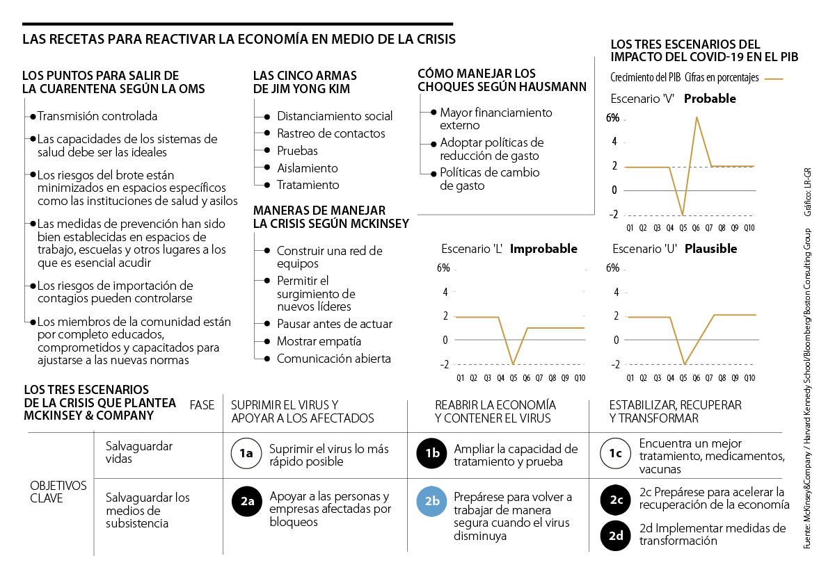 Luego de que se tenga el virus controlado se podrá pasar a reactivar la economía. Para ello, un estudio de McKinsey & Company recomienda mantener el aislamiento por regiones (donde haya más número de casos y el sistema de salud no pueda responder), reactivar los sectores más importantes con algunos protocolos y trabajar en campañas para educar a las personas.