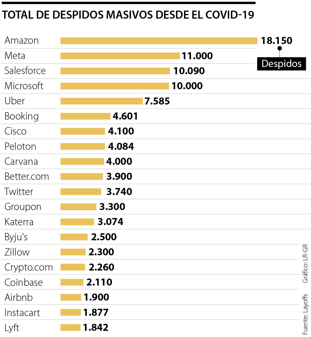 Las que lideran los despidos son Amazon, con 18.150 puestos de trabajo eliminados, seguido por Meta, con casi 11.000 puestos
