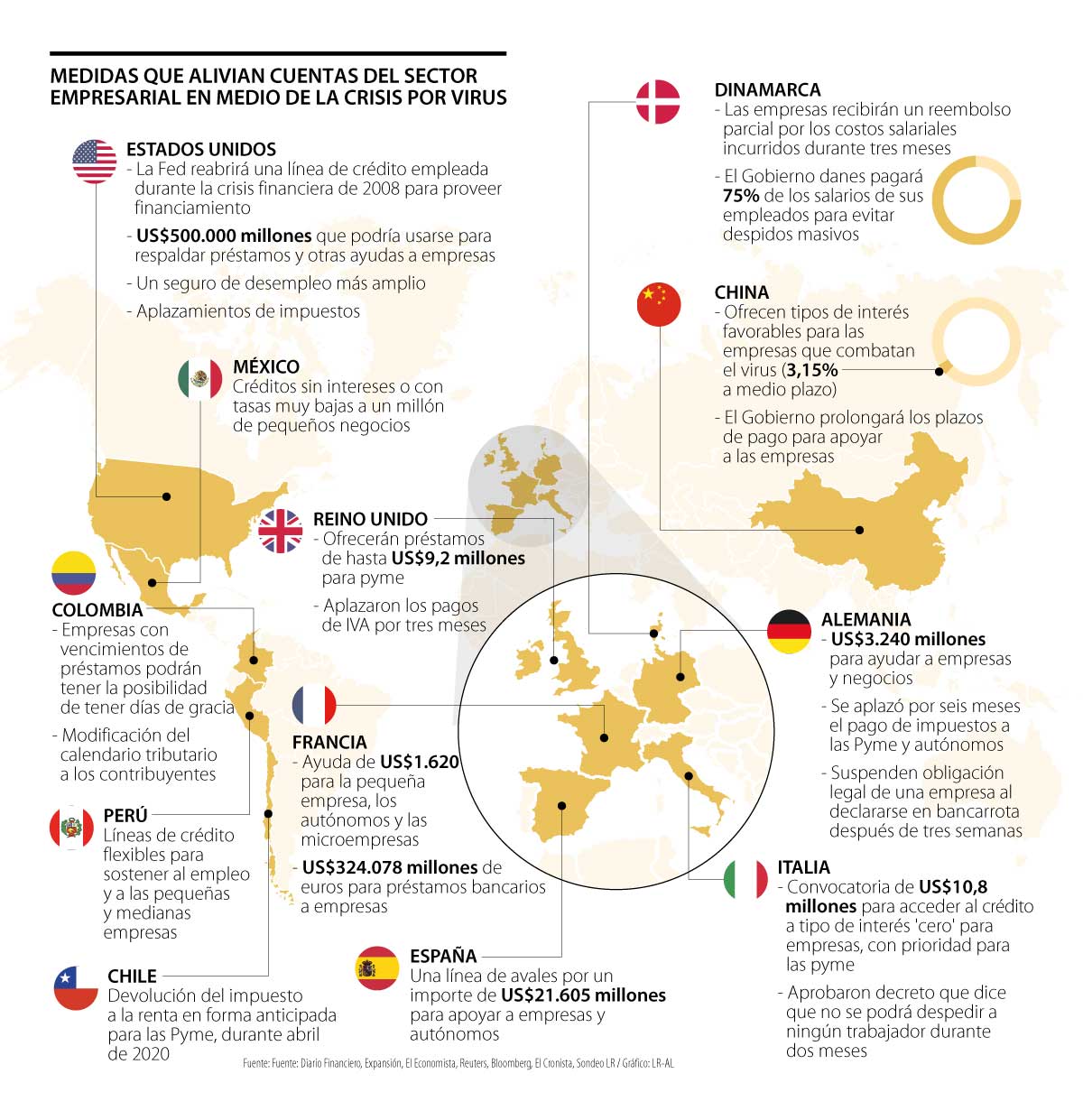 España, Alemania, Dinamarca, China y Estados Unidos también han adoptado medidas para proteger a las empresas. Por ejemplo, el gobierno español aplazará y fraccionará el pago de impuestos por seis meses de las empresas que lo soliciten previamente, mientras que el gobierno danés tiene el fraccionamiento del pago de impuestos por seis meses con solicitud previa.