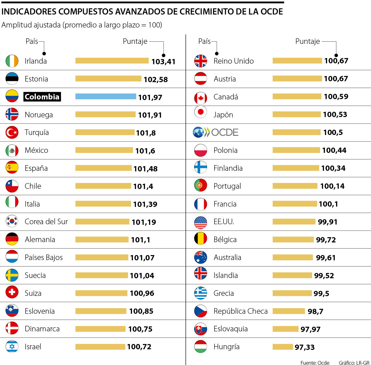 En cuanto a Colombia, el país obtuvo el tercer valor más elevado entre los miembros de la organización, con 101,97 puntos en diciembre; solo fue superado por Estonia e Irlanda, que tuvieron 102,58 y 103,41 puntos, respectivamente.
