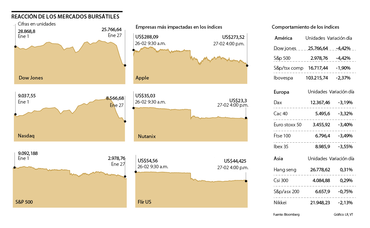 Además de los resultados del Dow Jones, el comportamiento negativo del S&P 500 también sorprendió a los inversores, ya que “bajó después de que el gobernador de California dijo que el estado estaba monitoreando a 8.400 personas en busca de signos del virus después de que viajaron a Asia”, según Bloomberg que también informó que “Goldman Sachs redujo a cero su perspectiva para el crecimiento de las ganancias de las compañías estadounidenses”.