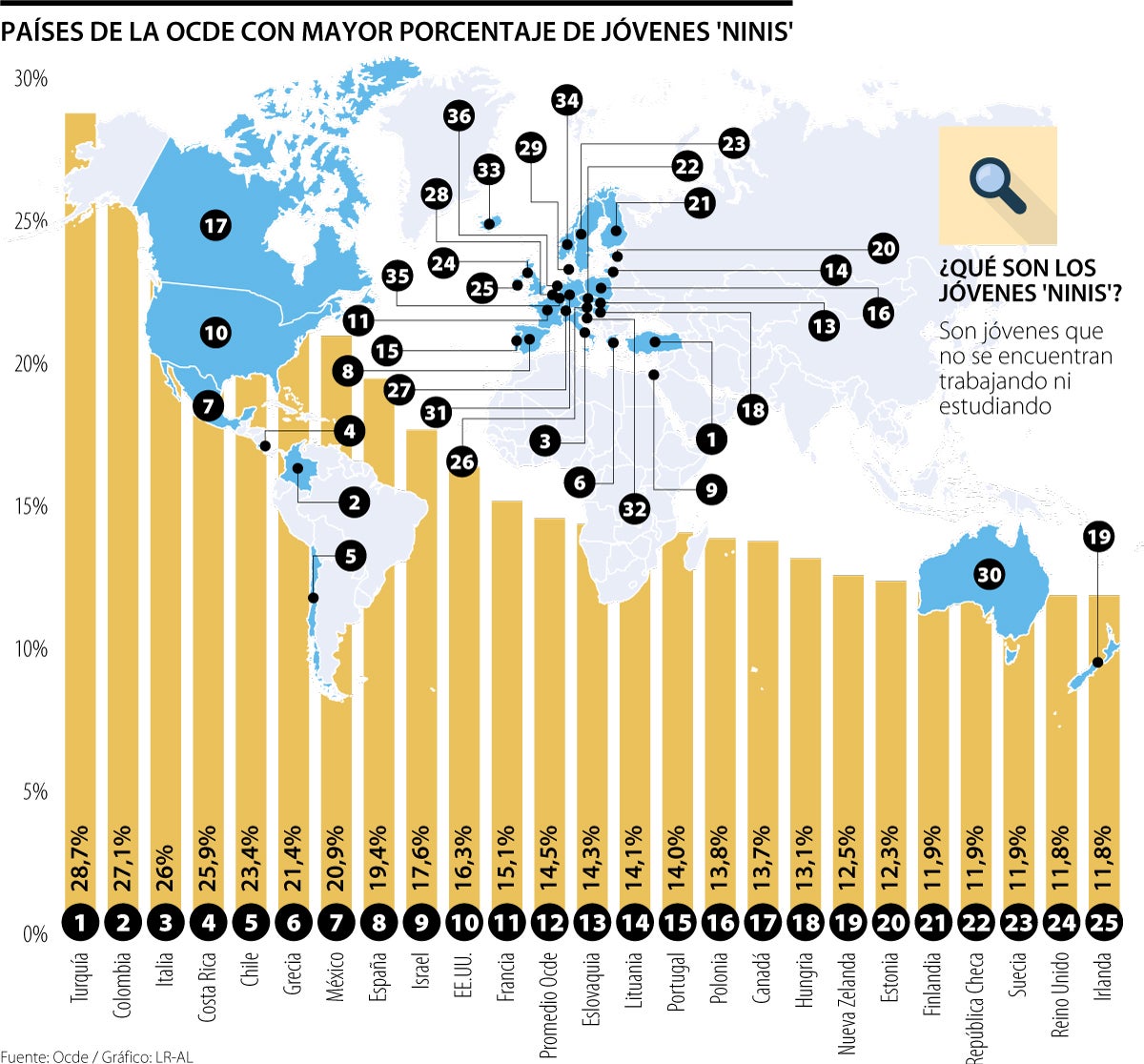 En Colombia, 27,1% de los jóvenes, según cifras de la Ocde, están entre la categoría de ‘ninis’, siendo el segundo país de la medición (ver gráfico) con el mayor porcentaje, superado únicamente por Turquía que tiene 28,7%.
