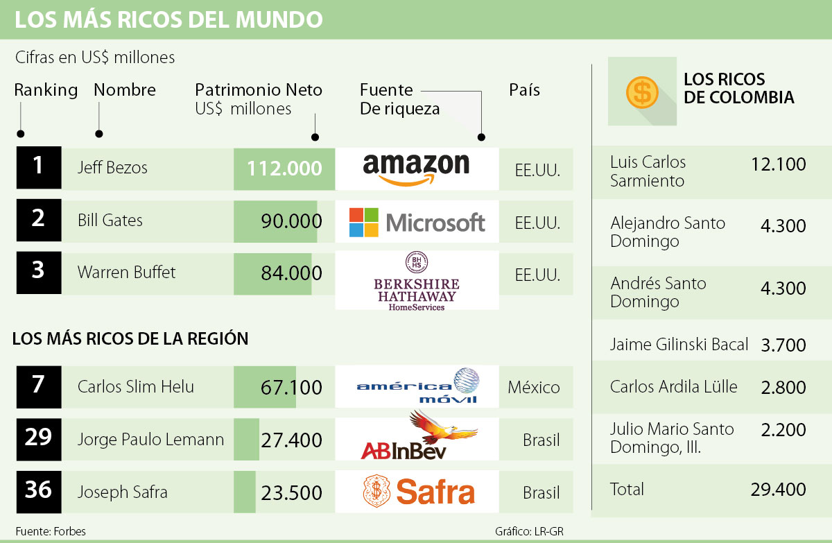La versión número 32 de la lista de multimillonarios de la revista Forbes rompió un récord y este año logró incluir a 2.208 empresarios que suman un patrimonio de US$9,1 billones. En los primeros puestos están Jeff Bezos, fundador y propietario de Amazon; Bill Gates, cofundador de Microsoft; y Warren Buffett, CEO de Berkshire Hathaway (ver recuadro).