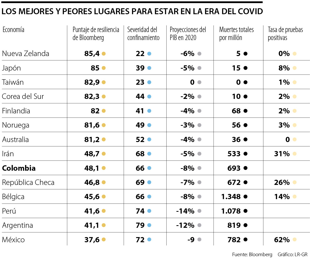 A medida que los datos cambien en los próximos meses, el Ranking de Resiliencia al Covid de Bloomberg también cambiará; actualizaremos la imagen a medida que evolucione.