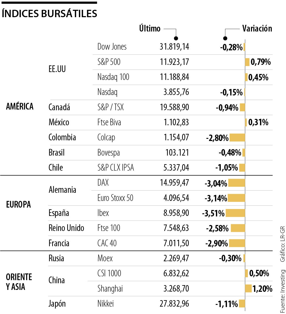 El indicador Ibex 35 de España presentó un fuerte desplome con una variación de -3,51% disminuyendo hasta 8.958,90 puntos. Mientras que el índice bursátil de Reino Unido Ftse 100 disminuyó 2,58% con hasta 7.548,63 puntos. Alemania DAX cerró con 14.959,47 puntos y una variación de -3,04%, del mismo modo Euro Stoxx 50 decreció a 4.096,54 puntos con una caída en variación de -3,14%. El mercado Francés también se vio afectado con el índice CAC 40 el cual tuvo una caída de 7.011,50 puntos y una variación negativa de -2,90%.