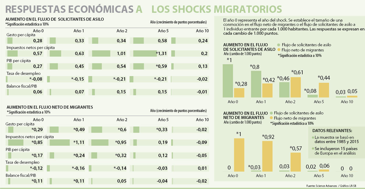 Los resultados que arrojó la investigación fueron alentadores gracias al aumento en el flujo de solicitantes de asilo. Entre los más destacados se encuentran un aumento de 0,32% en el PIB per cápita durante cuatro años seguidos, además de una caída de 0,14 puntos porcentuales durante el mismo periodo de tiempo y una mejoría de 0,11 puntos porcentuales en el saldo fiscal de las naciones monitoreadas en el estudio. Asimismo, el gasto per cápita crece 0,3 puntos porcentuales y los impuestos netos per cápita aumentan 0,74 puntos porcentuales.