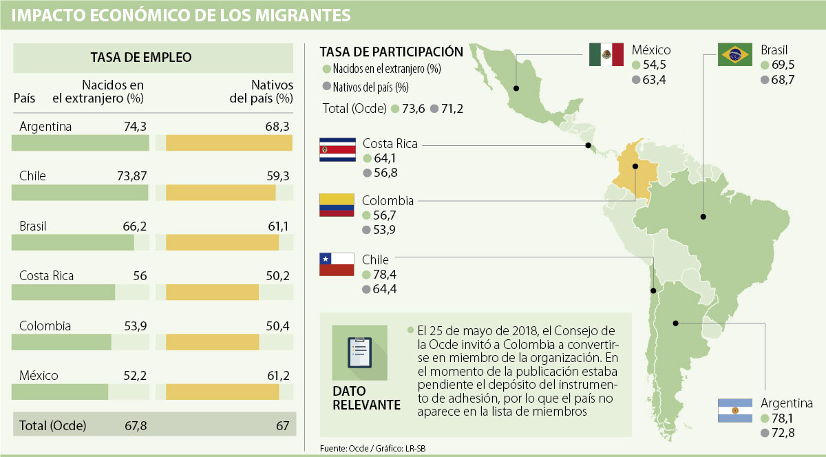 Las tasas oficiales de la Ocde en materia de empleabilidad se ubican en 67,8% para migrantes y 67% para nacionales, superados por 0,8 puntos porcentuales. Al observar los países de la región en particular, el único que supera ese promedio en ambos casos es Argentina, con 74,3% en el primero y 68,3% en el segundo.
