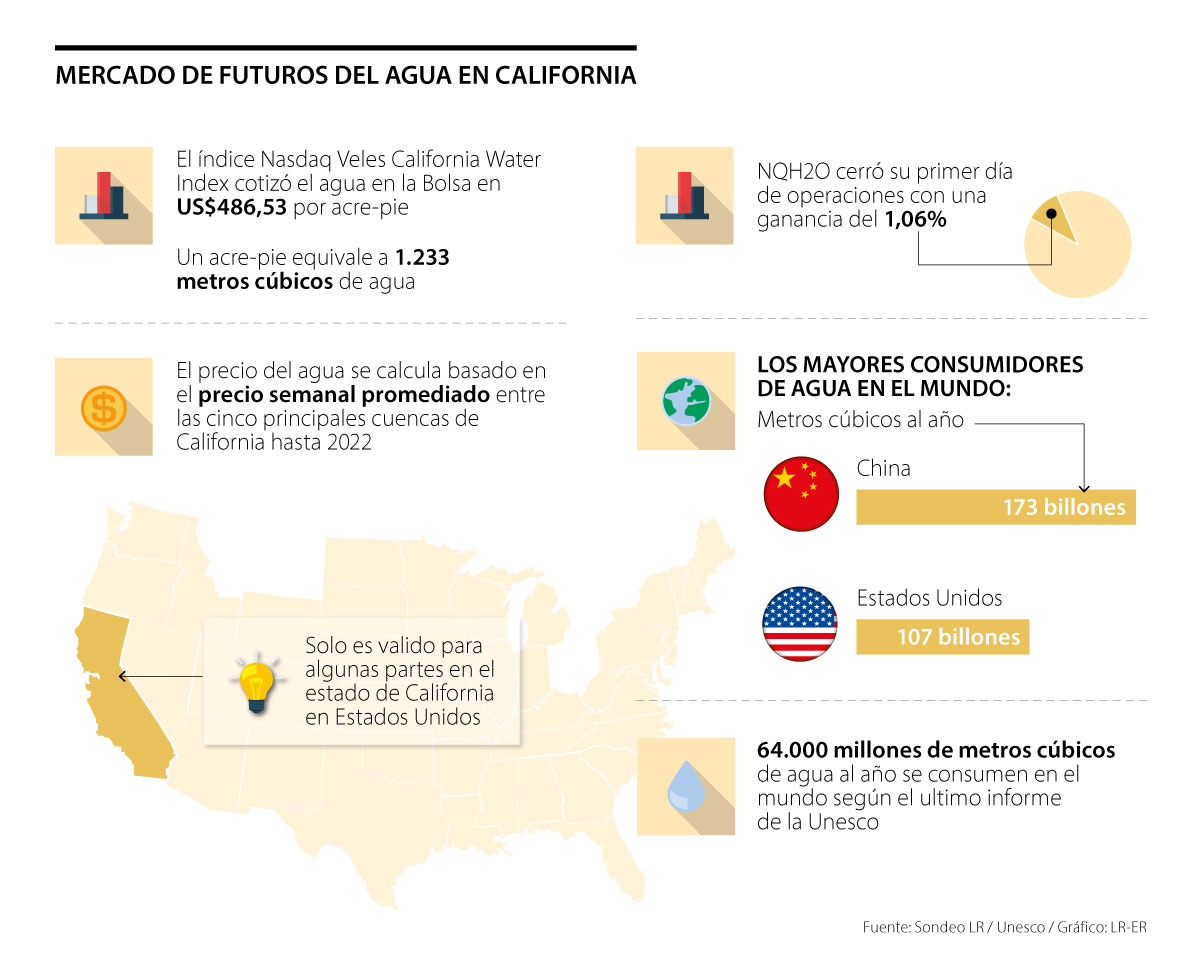 Teniendo claro este panorama, el agua ingresó al mercado de futuros de Wall Street bajo el índice Nasdaq Veles California Water Index que opera desde 2018 y que es el encargado de marcar los precios de los futuros del agua basado en las cinco principales zonas de California con mayor volumen de transacciones de este tipo.