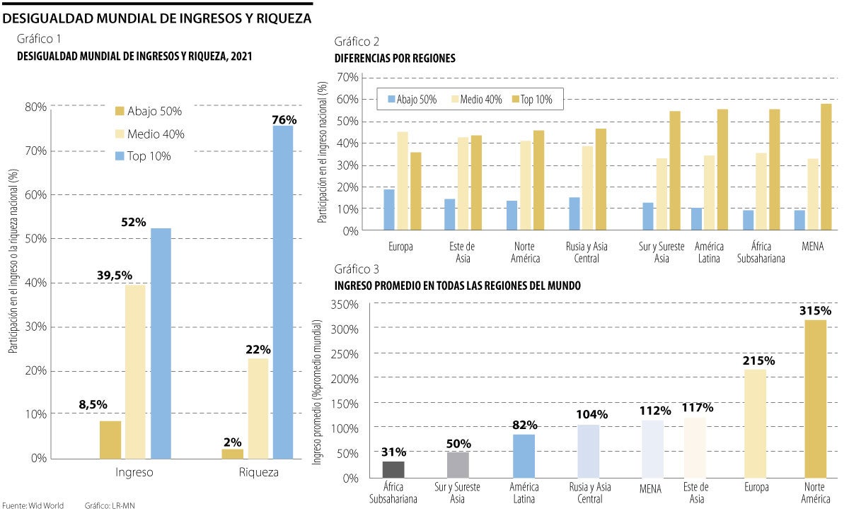 La brecha económica en el mundo es cada vez más evidente, pues los más ricos son sólo 10% de la población mundial, quienes captan 52% de los ingresos totales globales, la mitad más pobre de los habitantes se queda con 8,5% del mismo.
