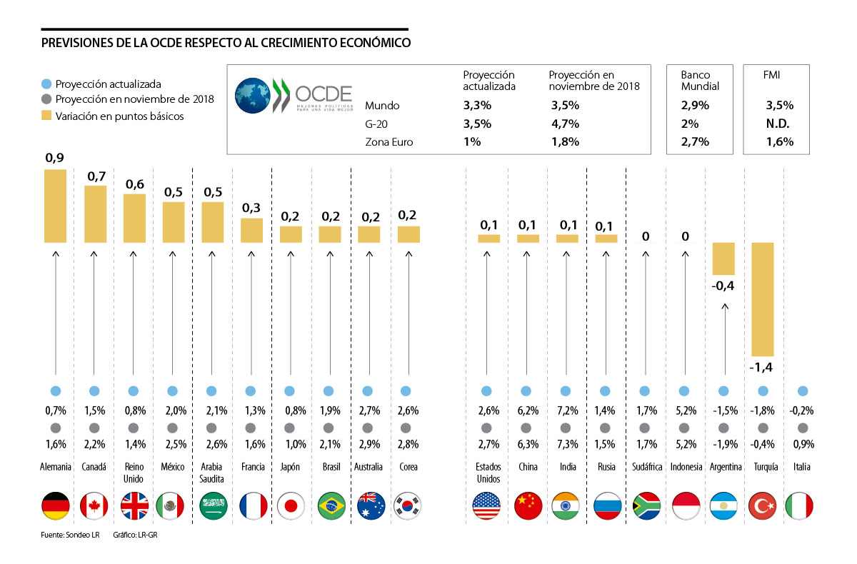 Este listado es cónsono con el escenario general, pues el organismo también redujo la proyección de crecimiento mundial pasando de una variación de 3,5% (previsión anunciada en noviembre de 2018) a 3,3%.