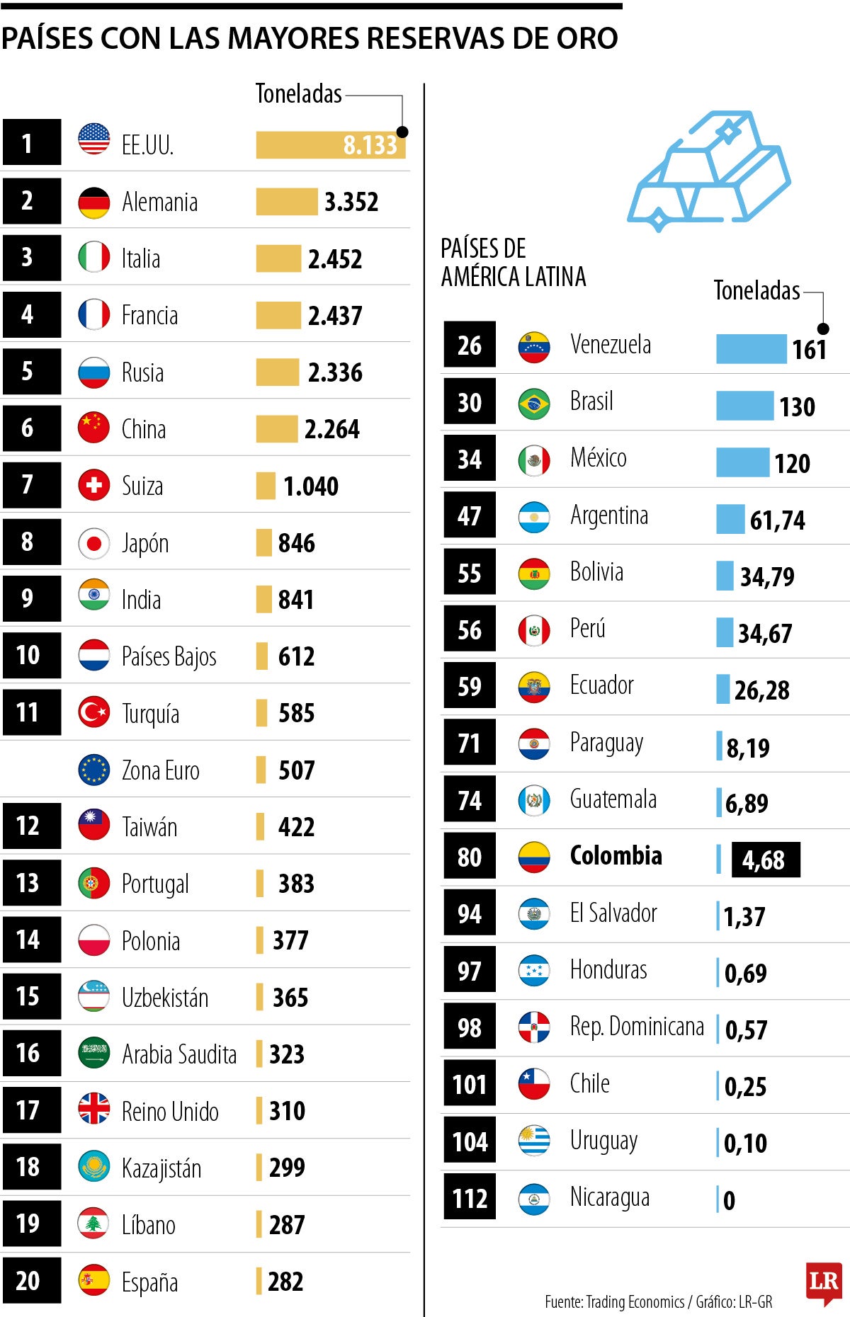 Pero, ¿cómo están las reservas de los países emergentes de América Latina?, ninguno entra al top 20 de los de mayores reservas. Venezuela es el país con la mayor cantidad, con 161 toneladas, y se ubica en el puesto 26 global, es seguido por Brasil en puesto 30 y 130 toneladas, y México de 120 toneladas). Colombia aparece hasta el puesto 80 solo con 4,68 toneladas y es, a su vez, el décimo entre 17 países de la región. En los últimos lugares está Chile con 0,25 toneladas, Uruguay con 0,10 toneladas y Nicaragua con ninguna.