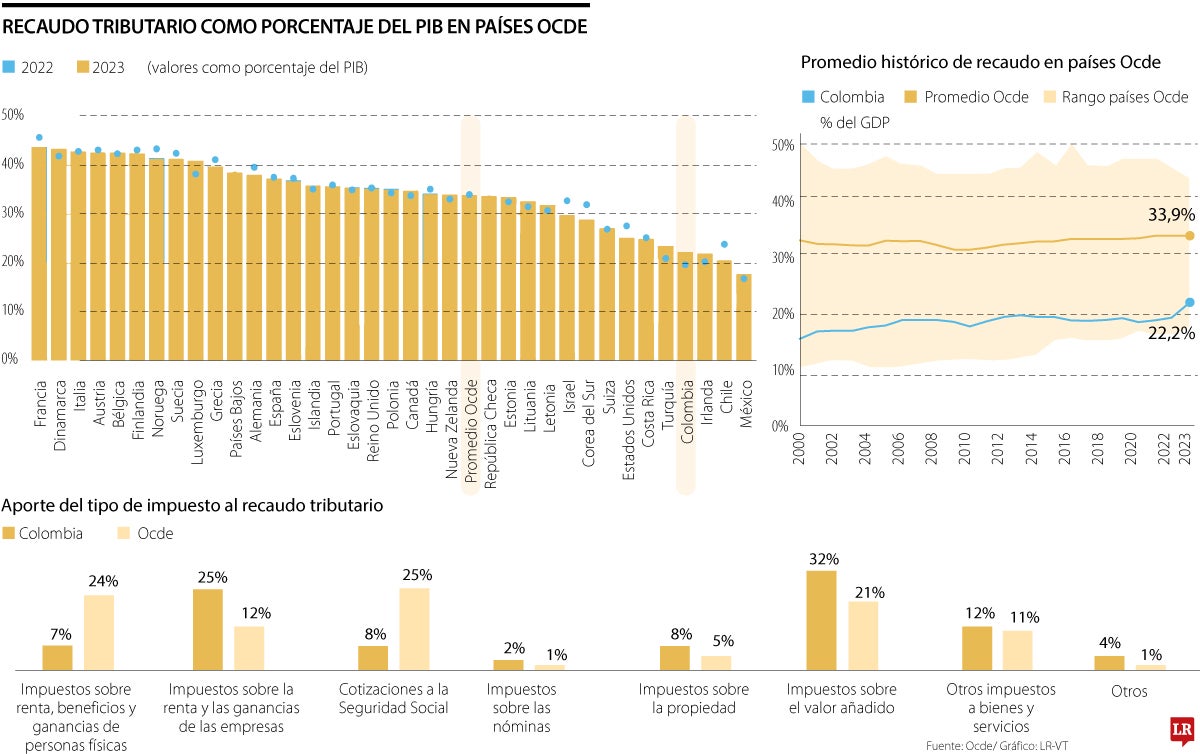 Aunque Colombia mejoró en 2,6% el registro de 2022 y tuvo el segundo mayor repunte en un año, se posicionó como el cuarto país con el peor recaudo tributario con 22,2%, solo por delante de Irlanda, Chile y México.